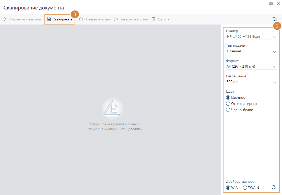 ПРИМЕЧАНИЕ. В систему со сканера можно занести одностраничный или многостраничный документ. Если используется поточный сканер, то отсканируется сразу вся пачка вложенных страниц. Если страницы содержат текст с двух сторон, то в выпадающем списке сканеров выберите устройство, поддерживающее двустороннее сканирование.