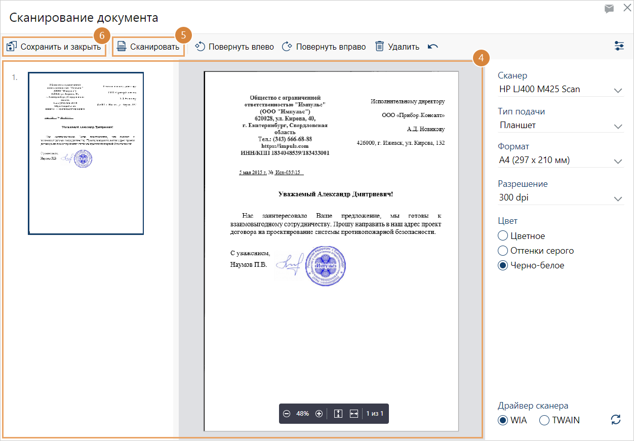 Чтобы занести документ со сканера в систему: