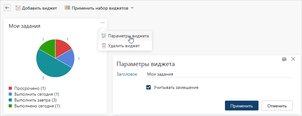 При первом входе в систему в области виджетов отображается один из доступных вам наборов виджетов. Чтобы открыть другой набор, в выпадающем списке Применить набор виджетов выберите нужный набор: