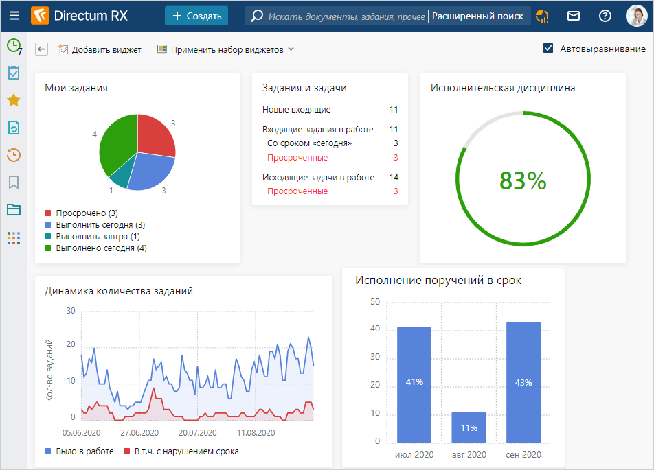 Область виджетов представляет собой контрольную панель с информацией по заданиям, документам, исполнительской дисциплине и загрузке сотрудников для мониторинга работы сотрудников в системе и повышения эффективности бизнес-процессов компании. Каждый сотрудник может настроить область виджетов для получения необходимой информации и организации своей работы.