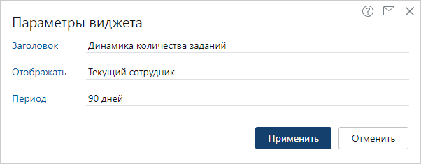 Период, за который отображается динамика работы с заданиями. Возможные значения: 30 дней, 90 дней, 180 дней. По умолчанию данные в виджете отображаются за последние 90 дней.