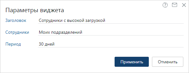 Период, за который отображается загрузка сотрудников. Возможные значения: 30 дней и 90 дней. По умолчанию данные в виджете отображаются за последние 30 дней.