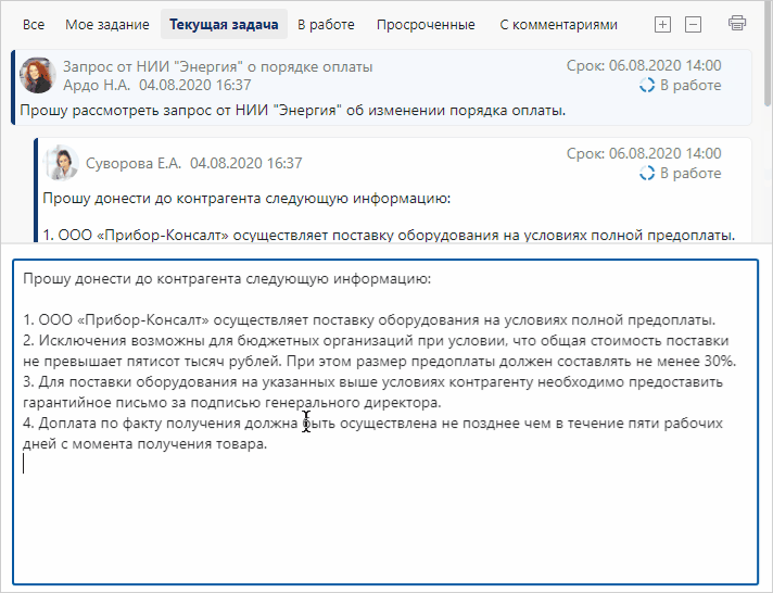 1.В папке «Входящие» перейдите в карточку задания. Посмотрите срок выполнения, ознакомьтесь с текстом задания в области переписки.