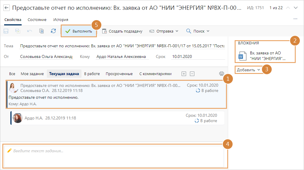 3.Добавьте вложения, например, документы с результатами выполнения задания. Подробнее см. раздел «Вложения в задачи и задания».