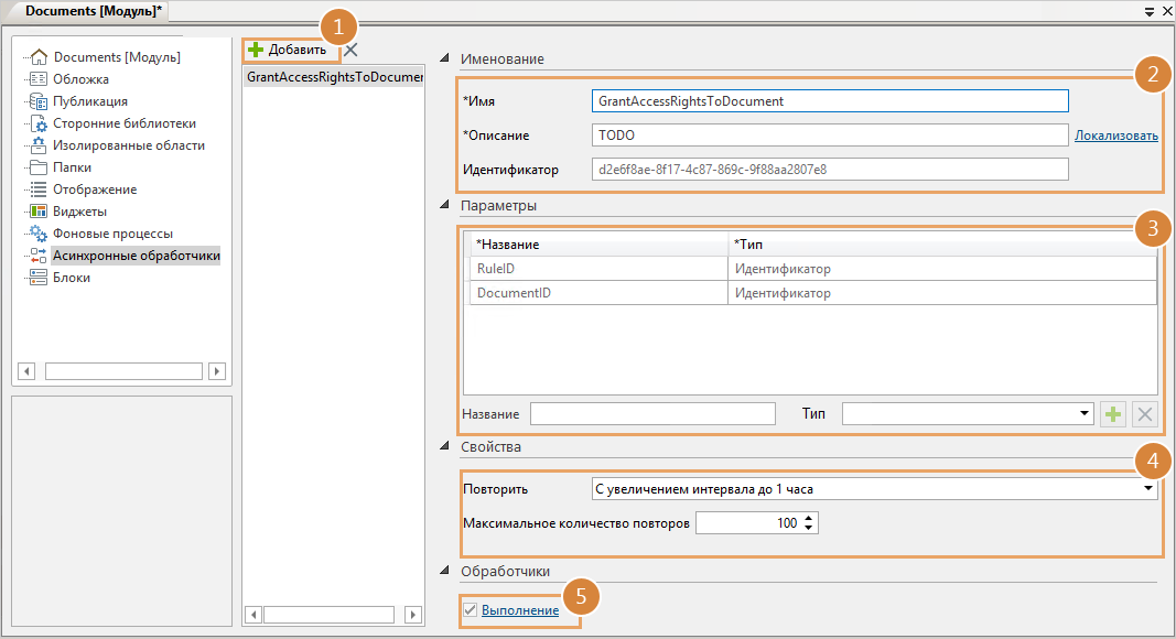 1.Откройте редактор модуля, в котором будет создан асинхронный обработчик. В узле «Асинхронные обработчики» нажмите на кнопку Добавить.