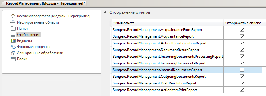 Например, чтобы в перекрытом модуле Sungero.RecordManagement скрыть отчет Журнал внутренних документов, снимите флажок рядом с отчетом Sungero.RecordManagement.InternalDocumentsReport: