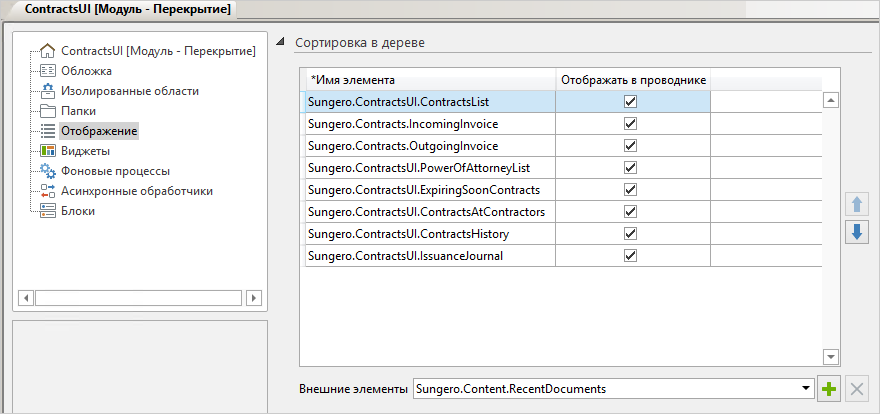 3.В выпадающем списке Внешние элементы для выбора доступны типы сущностей и вычисляемые папки системных модулей и модулей, с которыми установлены зависимости. Выберите элементы, которые нужно отображать в текущем модуле, затем нажмите на кнопку