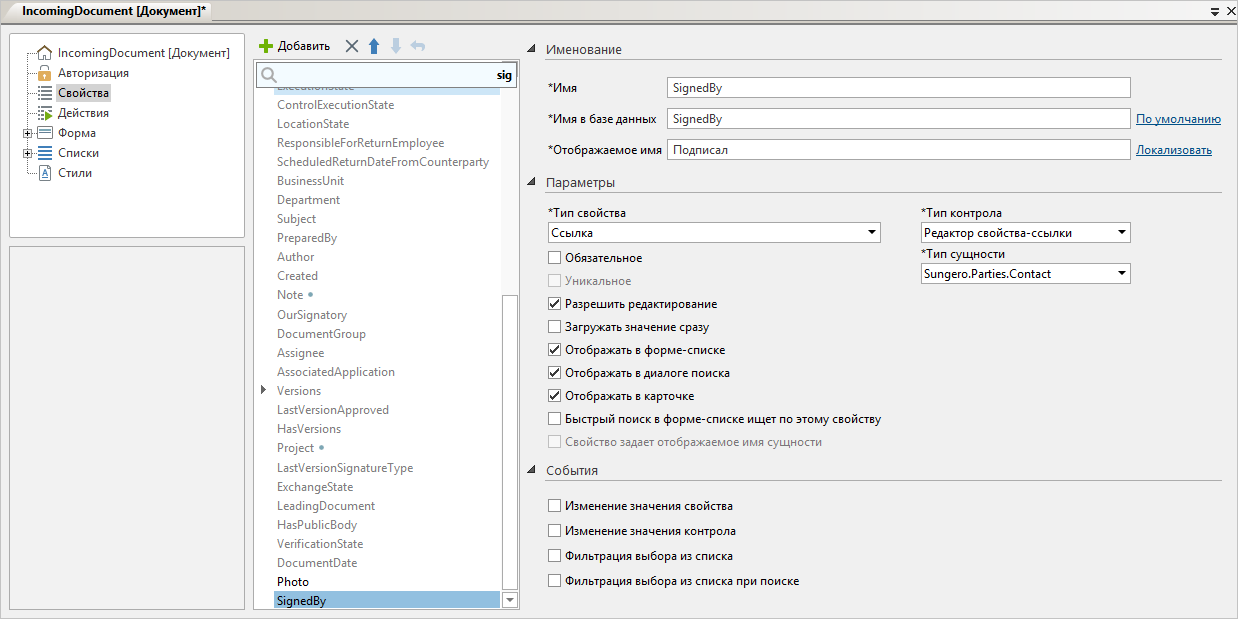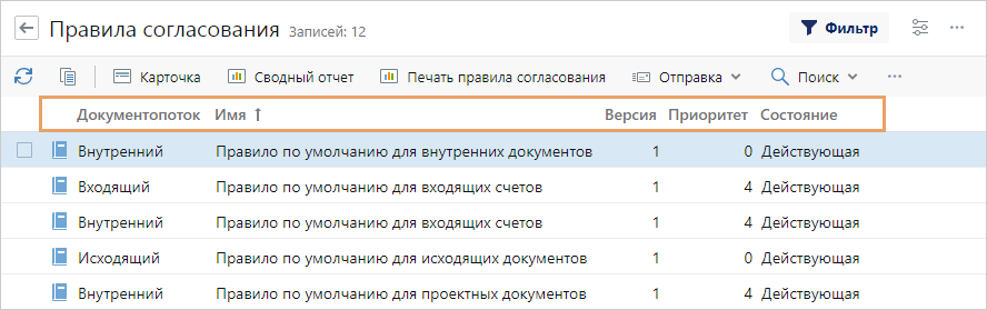 *Тип свойства. В зависимости от типа для свойства определяется: •формат, в котором будет задаваться и храниться значение свойства; •тип контрола, в котором будет отображаться значение свойства; •список дополнительных параметров свойства. *Тип контрола. Контрол для отображения данных свойства. Заполняется автоматически в зависимости от выбранного типа свойства. Обязательное. Свойство будет обязательным для заполнения. В карточке сущности перед названием свойства добавится символ *. Уникальное. Значение свойства должно быть уникальным в рамках типа сущности. Например, уникальным должно быть значение свойства Id входящего документа. Доступно для свойств типа Строка, Целое и Идентификатор. Если флажок установлен в родительском типе, то при наследовании и перекрытии его нельзя снять. ПРИМЕЧАНИЕ. Значения свойств с параметром Уникальное при наследовании будут уникальными в рамках свойства-предка. Например, можно создать справочник и присвоить свойству Id типа Идентификатор параметр Уникальное, а потом создать справочник-наследник. Если добавить две записи в справочник-родитель и одну запись в справочник-наследник, то значения свойств Id будут, соответственно, Id 1 и Id 2 для справочника-родителя и Id 3 для справочника-наследника. Разрешить редактирование. Свойство будет доступно для изменения в карточке сущности. Загружать значение сразу. При получении сущности с веб-сервера свойство будет загружаться вместе с сущностью («жадная» загрузка). Используется для оптимизации программного кода, так как позволяет сократить количество запросов к веб-серверу. Вместе с сущностью рекомендуется загружать свойства простых типов, например, число, строка. Загрузка всех свойств сущности может увеличить время выполнения запросов и привести к росту сетевого трафика. Совет. Снимите флажок, если необходимо, чтобы свойство загружалось с веб-сервером только при непосредственном обращении к свойству. Например, чтобы содержимое версии загружалось отдельно от карточки документа. Отображать в форме-списке. Свойство можно будет использовать в качестве колонки в списке и папке сущностей. Доступно для свойств типа Дата, Перечисление, Строка, Ссылка, Логическое, Целое, Идентификатор, Вещественное и Текст. Например, для справочника «Правила согласования» флажок установлен для свойств Документопоток, Имя, Версия, Приоритет, Состояние. При настройке внешнего вида списка правил согласования эти свойства можно отобразить в качестве колонок списка: Отображать в диалоге поиска. Параметр является устаревшим и оставлен для совместимости. Отображать в карточке. Свойство будет отображаться в карточке сущности. Примечание. Если в среде разработки элемент скрыт программно, то в веб-клиенте он не отобразится, даже если добавить его с помощью редактора форм в проводнике. Быстрый поиск в форме-списке ищет по этому свойству. По значениям свойства можно будет выполнять быстрый поиск в списке сущностей в проводнике системы. Доступно для свойств типа Строка и Ссылка. Свойство задает отображаемое имя сущности. Значение свойства будет отображаться в контроле свойства-ссылки на данный тип сущности. Например, если свойство является ссылкой на тип сущности Обращение, то в контроле может отображаться название обращения. Для типа сущности можно задать одно свойство с д
