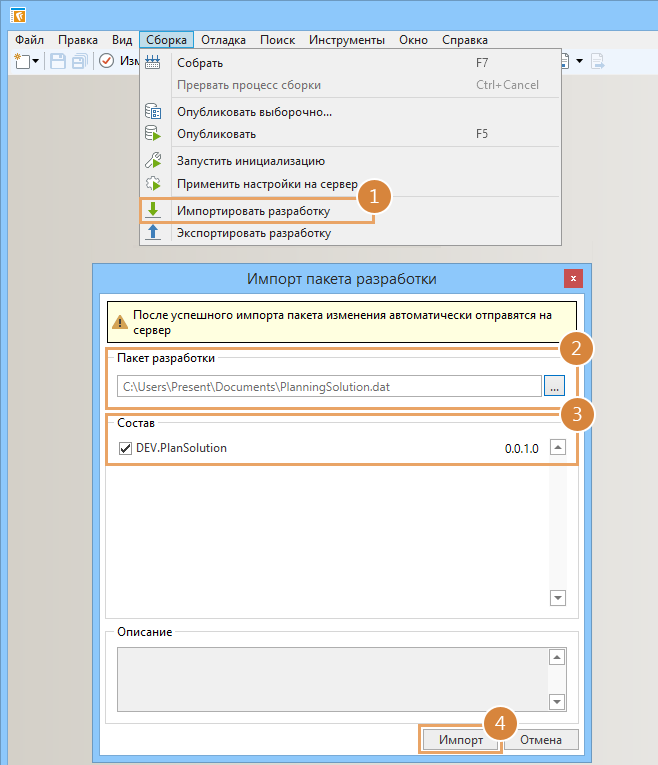 Если вам передали пакет разработки с новыми или измененными решениями, импортируйте его в свою среду разработки: