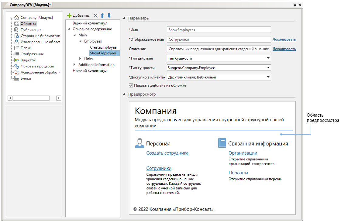 ПРИМЕЧАНИЕ. Узел «Обложка» отображается, если в редакторе модуля установлен флажок Отображать в проводнике. При создании новых модулей флажок снят, так как их обложки настраиваются в веб-клиенте.