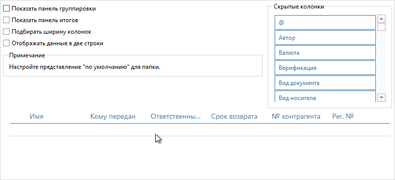 Показать панель группировки. По умолчанию будет отображаться панель для группировки записей. При необходимости настройте группировку записей по значению колонки. Для этого перетащите заголовок колонки на панель группировки. Например, для удобной работы со списком договорных документов можно сгруппировать список по ответственным за возврат. Показать панель итогов. Настройка является устаревшей и оставлена для совместимости. Подбирать ширину колонок. Ширина колонок будет автоматически подбираться по ширине экрана. Отображать данные в две строки. Записи будут отображаться в две строки. Рекомендуется указывать, если содержимое отображаемой колонки не вмещается в одну строку. Скрытые колонки. В области находятся колонки, которые не будут отображаться в содержимом папки. Чтобы скрыть колонку, перетащите ее заголовок из табличной части в область Скрытые колонки. Порядок отображения колонок в содержимом папки можно изменить. Для этого переместите их заголовки в области предпросмотра. |