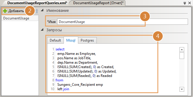 Например, для формирования отчета «Статистика работы с документами» добавляются следующие запросы: