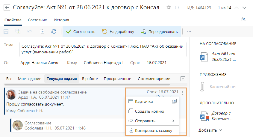 При следующем открытии карточки этого типа задачи или задания область переписки фильтруется по тому критерию, который выбирали последним. Например, если в карточке простого задания выбрать критерий Просроченные и закрыть карточку, то при следующем открытии карточки простого задания также будут показаны просроченные. При этом в карточке задания на согласование область переписки фильтруется по критерию Текущая задача, если ранее в других заданиях этого типа фильтрацию не изменяли.
