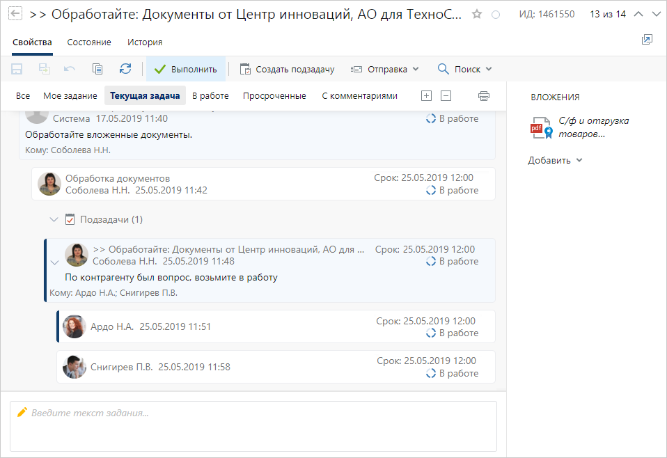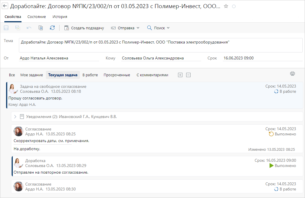 Область переписки по задаче включает в себя текст поставленной задачи и ее подзадач, а также все указанные при выполнении заданий результаты. Сотрудник, который отправил задачу на выполнение, с помощью переписки может подробно ознакомиться с текущим состоянием работ по задаче. Например, отследить, на ком остановилось согласование документа, просмотреть причины задержки работы по информации из текста задания и т.д. Для удобства для всех задач и заданий в области переписки справа наглядно отображаются статусы с состоянием работ и информация, если текст был изменен:
