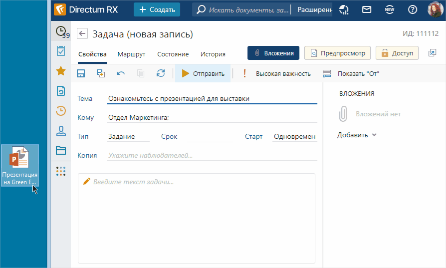 Чтобы быстро создать объект и добавить его во вложения задачи или задания, переместите сохраненный локально на компьютере документ в область вложений.