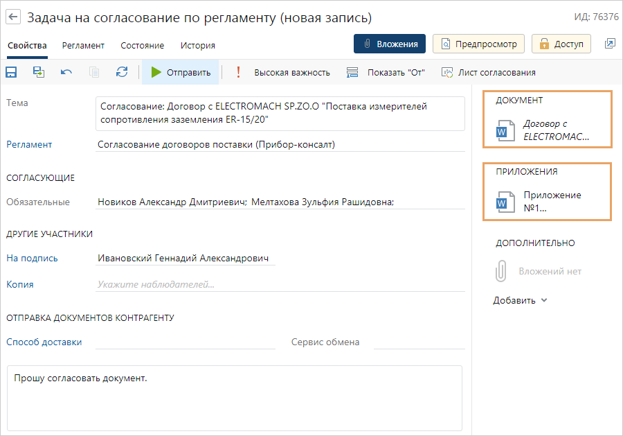 В зависимости от типа задачи, ее вложения могут быть разделены на группы. Группы вложений помогают участникам задачи ориентироваться в добавленных вложениях. Например, при отправке договора на согласование по регламенту ссылка на основной документ отображается в группе «Документ», а ссылки на приложения к основному документу – в группе «Приложения»: