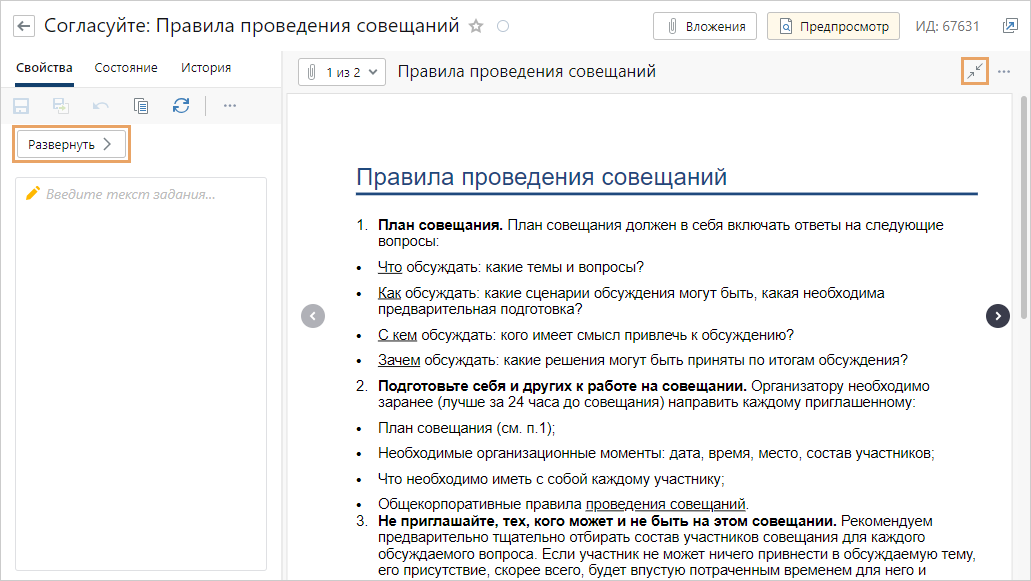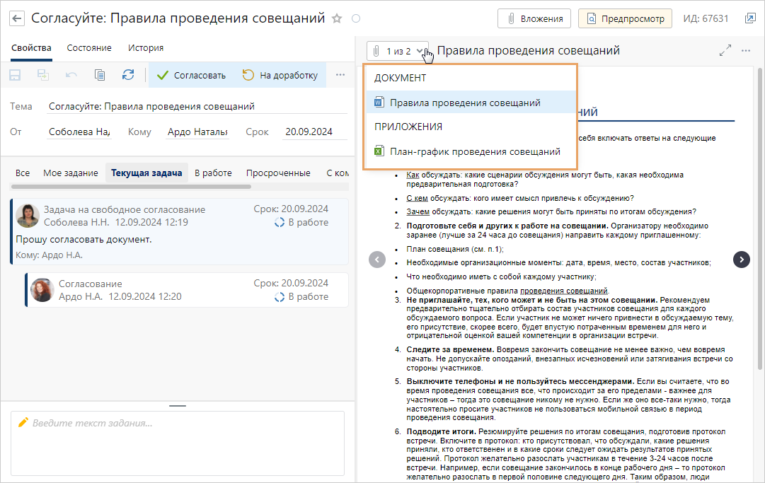 Примечание. Из вложений задач, заданий и уведомлений можно открыть на предпросмотр только документы. При этом для предпросмотра всегда отображается только последняя версия документа. Порядок работы и список поддерживаемых форматов те же, что и для окна предпросмотра документов.