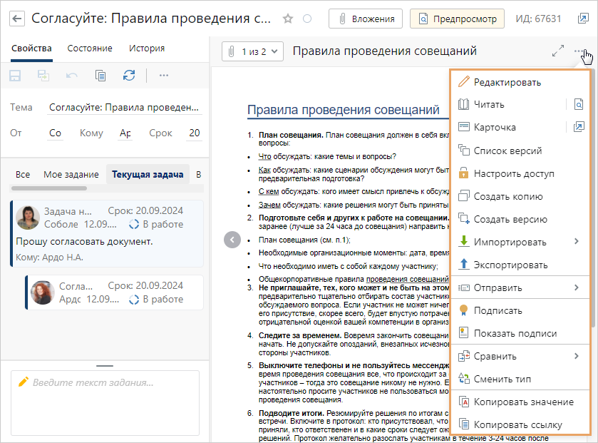 •изменять масштаб документа, отображать примечания и другие возможности, которые есть в окне предпросмотра. С помощью контекстного меню можно быстро открыть документ на редактирование, открыть его карточку, настроить права доступа и др.: