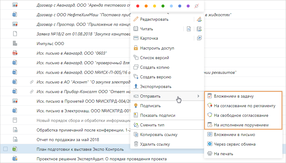 Над вложенными объектами можно выполнять действия, которые доступны через контекстное меню в проводнике системы. Например, можно открыть карточку объекта, поставить на него цветную метку, настроить права доступа или распечатать документ.