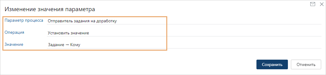 Для параметра процесса Отправитель задания на доработку: