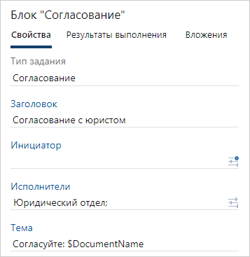 •в поле Тема укажите шаблон темы задания, которая отобразится в списке заданий руководителя. Например, «Согласуйте: $DocumentName», где $DocumentName – имя документа, который нужно согласовать;
