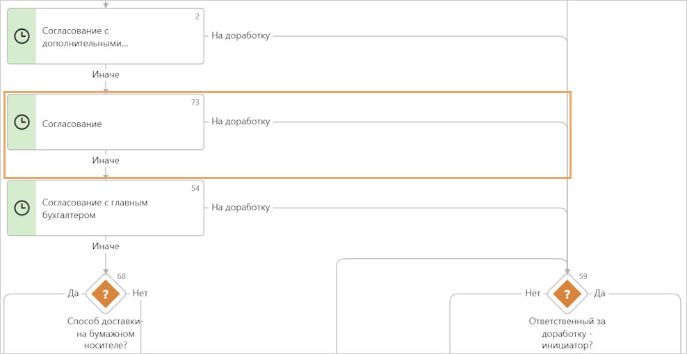 1.Добавьте новый блок «Согласование» между блоками «Согласование с дополнительными согласующими» и «Согласование с главным бухгалтером». 2.Уведите стрелку с результатом «На доработку» от нового блока к условию «Ответственный за доработку - инициатор?». 3.Для стрелки между новым блоком и блоком «Согласование с главным бухгалтером» укажите результат «Иначе». |