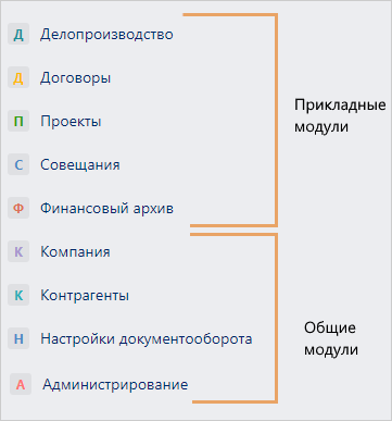 В базовую лицензию входят модули «Компания», «Контрагенты», «Настройки документооборота», и «Администрирование». Для работы с модулями «Делопроизводство», «Договоры», «Проекты», «Планирование проектов», «Совещания» и «Финансовый архив» необходимо приобрести лицензию. Если в компании приобретены решения «Agile-доски» и «База знаний», модули для них добавляются на панель навигации.
