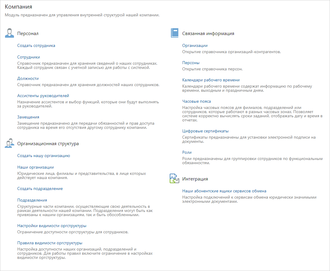 На обложках модулей содержатся часто используемые действия. С их помощью можно открывать справочники и списки, запускать отчеты, создавать объекты системы и т.д. Например на обложке модуля «Компания» можно настроить организационную структуру, добавить в систему новых сотрудников и задать для них уникальные календари рабочего времени.