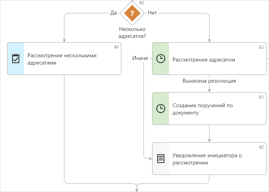 Если служебная записка отправлена нескольким сотрудникам, начинается задача на рассмотрение документа несколькими адресатами. Подробнее см. раздел «Процесс и схема рассмотрения документа». По завершении рассмотрения процесс согласования служебной записки завершается.