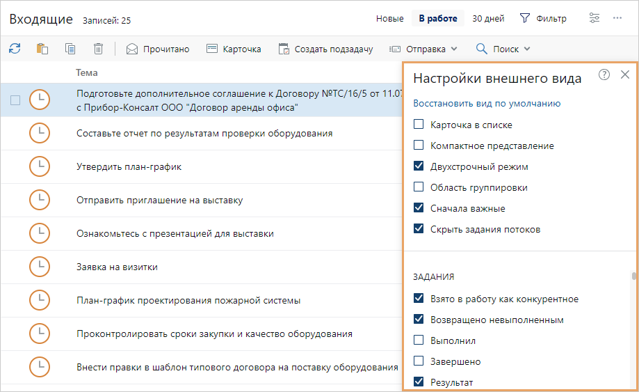 На панели настройки внешнего вида можно задать отображение записей в списках. Например, чтобы в списке входящих сначала отображались задания с высокой важностью, откройте панель навигации по кнопке