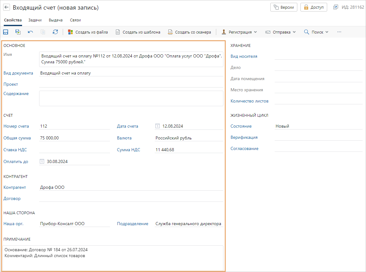 Такие документы поступают в систему сразу с типом «Входящий счет», с печатной формой и автоматически заполненными полями в карточке:
