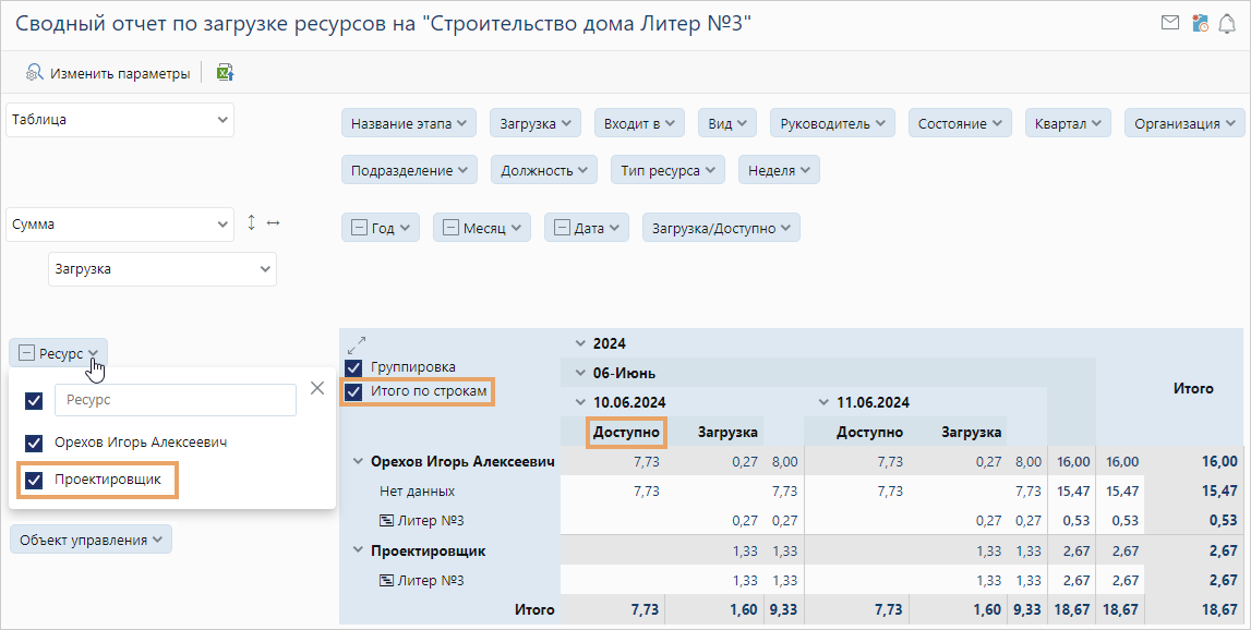 Раньше в сводном отчете по загрузке ресурсов руководители могли посмотреть информацию только по сотрудникам. Теперь появилась возможность отслеживать загрузку всех производственных ресурсов, например оборудования или проектировщика, работающего на аутсорсе. Это позволяет составить полную картину по ресурсам при планировании проектов.