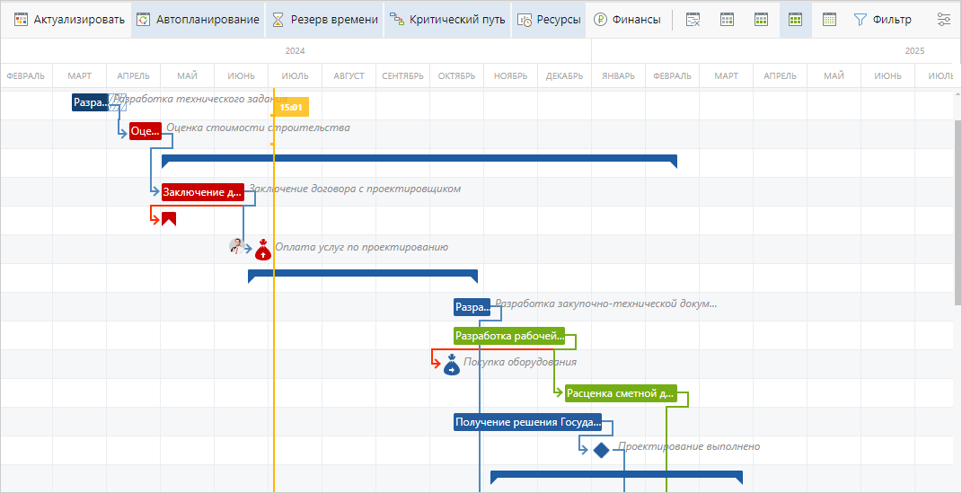 . Руководитель может проанализировать их сроки и влияние на проект. На диаграмме можно увидеть, какие финансовые операции просрочены, какие завершены, а какие влияют на критический путь проекта. Например, незавершенные финансовые операции с истекшим сроком отображаются красным цветом: