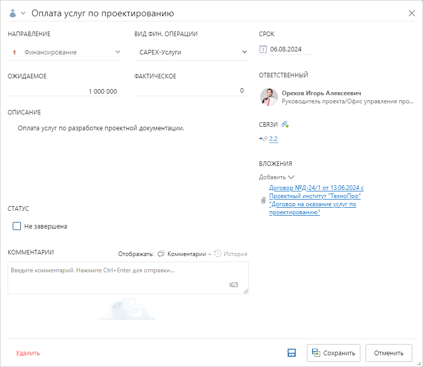 Чтобы обеспечить эффективность проекта, важно оценивать его финансовые показатели. В новой версии решения появилась возможность отслеживать финансовые операции в рамках проекта.