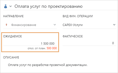 Плановая сумма операции заполняется вручную в поле Плановое. Если после утверждения версии плана условия изменились и сумму нужно актуализировать, то значение можно исправить в новой версии в поле Ожидаемое. Отклонение от планового значения рассчитывается автоматически: