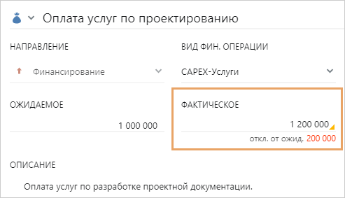 Фактическое значение также рассчитывается автоматически по сумме транзакций, связанных с операцией. При необходимости его можно ввести вручную, например, для предварительного расчета затрат. Для завершенных операций руководитель может посмотреть отклонение от планового или ожидаемого значения в текущей версии плана: