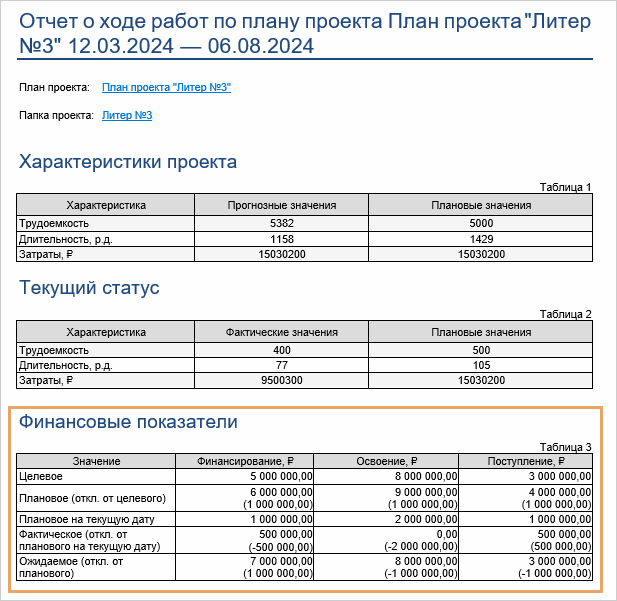 Теперь в отчете о ходе работ отображаются не только основные характеристики проекта, но и его финансовые показатели. Благодаря этому руководитель видит всю важную информацию в одном документе. При этом финансовые данные доступны только для тех сотрудников, которые входят в команду управления проектом или в роль «Аудиторы»: