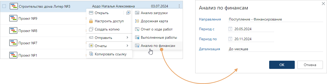Подробную информацию о финансовых показателях проекта можно посмотреть в отчете «Анализ по финансам». Отчет доступен сотрудникам, которые включены в роль «Команда управления» или предопределенную роль «Аудиторы». Чтобы сформировать отчет, нужно в контекстном меню портфеля, программы или проекта выбрать пункт Анализ по финансам, затем указать направления операций, отчетный период и детализацию. Кроме того, отчет можно составить сразу по всем объектам управления в системе.